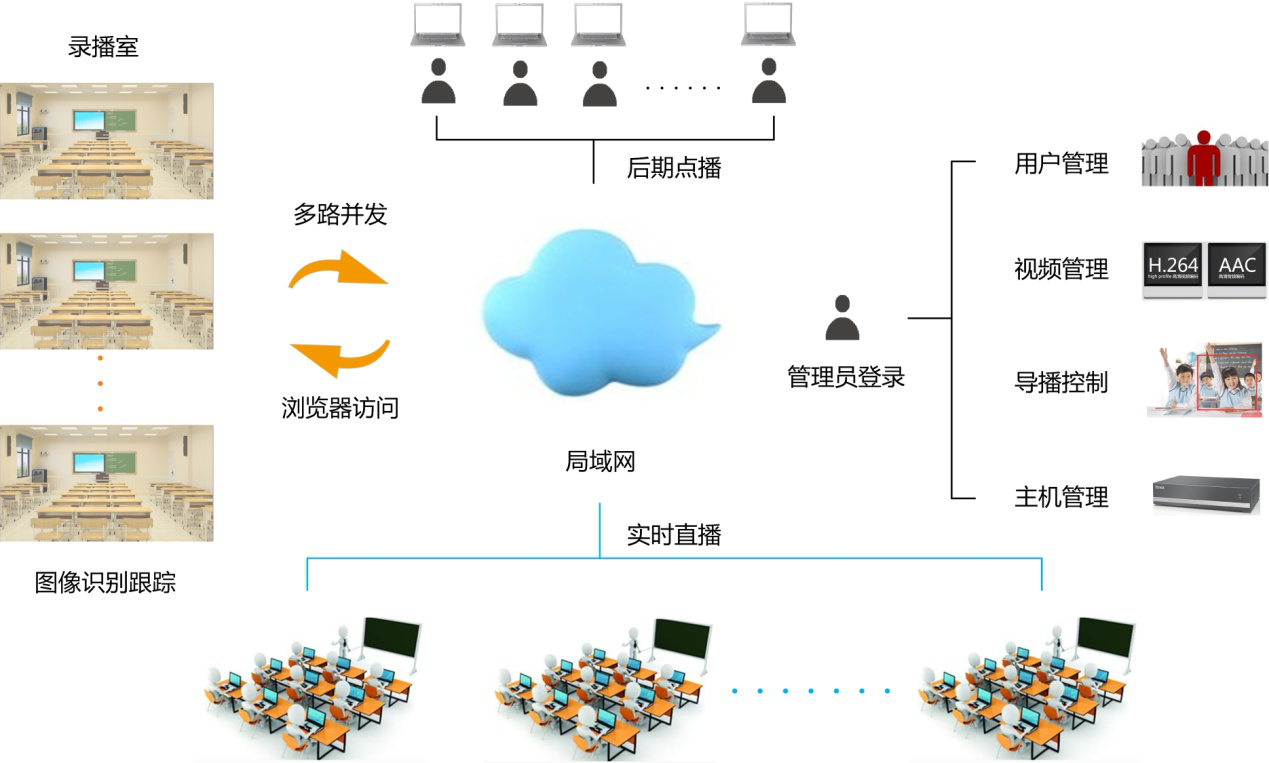 騰亞班班通錄播系統采用B/S架構實現用戶訪問,師生通過瀏覽器即可實現在線直播觀看、后期點播回放以及視頻文件下載,管理員無需身處錄播課室現場,通過辦公室電腦即可完成用戶管理、視頻管理、導播控制、主機管理工作。騰亞班班通錄播系統支持100路用戶同步直播/點播操作,輕松滿足校內用戶訪問需求。騰亞班班通錄播系統采用開源Linux操作系統進行開發,內置高清管理系統軟件,系統穩定,操作簡單。